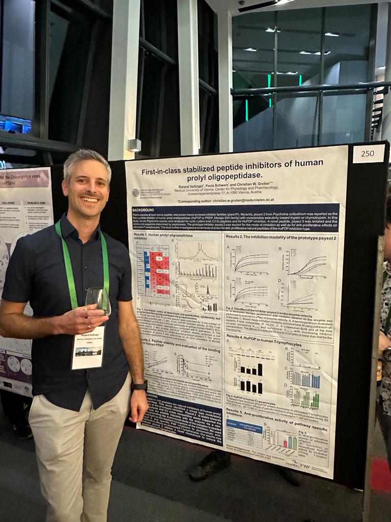 Our research group attended the 13th International Peptide Symposium and 15th Australian Peptide Conference held in Brisbane, Australia from October 15th to 20th. We were delighted to be a part of the fantastic scientific program that was organized. The event featured several presentations by our researchers, including a Rapid Fire talk given by Jasmin Gattringer, and three poster presentations by the PeptAIDes team. Furthermore, the Peptidomics and Drug Discovery research group contributed to the event with an oral presentation by Dr. Christian Gruber and another poster presentation. We acknowledge that Dr. Markus Muttenhaler, a member of our PeptAIDes advisory board, was honored with the prestigious Tregear Award by the Australian Peptide Society for his long-lasting contributions to the field of peptide science.