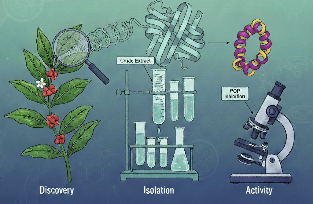 A new research article was published in the Journal Natural Products and Bioprospecting (IF 2024: 4.9). Hellinger et al. report the screening of eleven Psychotria species for cyclic cystine-knot peptides. Psysol 3 from Psychotria solitudinum was isolated as a prototypic inhibitor of human prolyl oligopeptidase. The synthetic peptide showed an IC50 = 1.3 µM and is thus one of the most active cyclotides known so far inhibiting the enzyme.